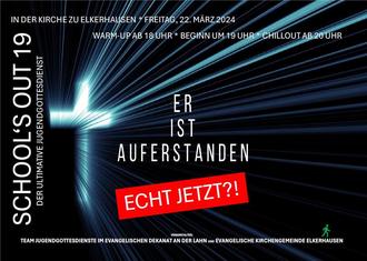 Der School's out-Gottesdienst findet statt am kommenden Freitag, 22. März, ab 18 Uhr in der Evangelischen Auferstehungsgemeinde in der Kirche zu Elkerhausen Pfarrstraße 4 / 35796 Weinbach (Elkerhausen)