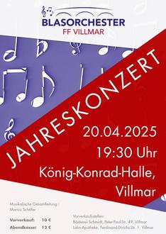 Das Blasorchester der Freiwilligen Feuerwehr Villmar lädt herzlich zum mit Spannung erwarteten Jahreskonzert am Ostersonntag, 20. April 2025, um 19:30 Uhr in die König-Konrad-Halle ein. Die Besucherinnen und Besucher erwartet ein abwechslungsreiches und vielfältiges musikalisches Programm.