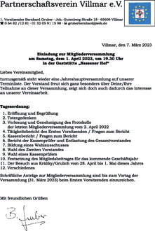 Schriftliche Anträge zur Mitgliederversammlung sind bis zum Vortag der Versammlung (31. März 2023) beim Ersten Vorsitzenden einzureichen.