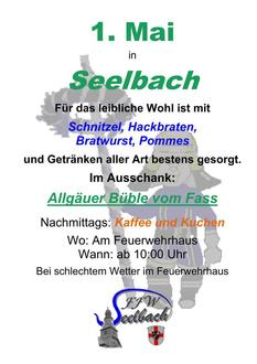 Die Freiwillige Feuerwehr Seelbach lädt ab 10.00 Uhr wieder zu ihrer 1. Mai Veranstaltung am Feuerwehrhaus ein. Für Speisen wie Schnitzel, Hackbraten, Würstchen und Pommes sowie Getränke aller Art ist bestens gesorgt. Im Ausschank Allgäuer Büble vom Fass. Am Nachmittag erwartet unsere Gäste Kaffee und ein reichhaltiges Kuchenbüffet. Bei schönem Wetter können Sie sich gemütlich unter Sonnenschirmen von Ihrer Wanderung oder Radtour erholen und ein paar schöne Stunden verbringen. Sollte das Wetter nicht so gut sein, findet die Veranstaltung in der Fahrzeughalle statt. Die Feuerwehr Seelbach freut sich auf Ihren Besuch und wünscht allen einen schönen 1. Mai.