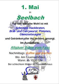 Die Freiwillige Feuerwehr Seelbach lädt ab 10.00 Uhr wieder zu ihrer 1. Mai Veranstaltung am Feuerwehrhaus ein. Für Speisen wie Schnitzel, Hackbraten, Würstchen, Pommes und Gemüselasagne sowie Getränke aller Art ist bestens gesorgt. Im Ausschank Allgäuer Büble vom Fass. Am Nachmittag erwartet unsere Gäste Kaffee und ein reichhaltiges Kuchenbüffet. Bei schönem Wetter können Sie sich gemütlich unter Sonnenschirmen von Ihrer Wanderung oder Radtour erholen und ein paar schöne Stunden verbringen. Sollte das Wetter nicht so gut sein, findet die Veranstaltung in der Fahrzeughalle statt. Die Feuerwehr Seelbach freut sich auf Ihren Besuch und wünscht allen einen schönen 1. Mai.