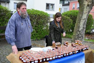 Mit frischem Löwenzahngelee aus der aktuellen Ernte und 24 weiteren beliebten Gelee- und Konfitüresorten war das Evangelische Marmeladenpfarramt beim "Pflanzenmarkt" auf dem Villmarer Brunnenplatz vertreten. Naturschutzverein Villmar und die Villmarer Landfrauen hatten zu diesem kleinen aber feinen Markt eingeladen. Und bei optimalem Wetter war einiges los. Und so freuten sich auch Marmeladenpfarrer Ulrich Finger und Tochter Sarina über geschäftliches Treiben und guten Umsatz.