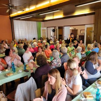 Kabarett, Kaffee, Kuchen und viel Spaß – so lässt sich die diesjährige Muttertagsfeier der Villmarer Landfrauen zusammenfassen. Fast 100 Frauen jeden Alters kamen im Nassauer Hof zusammen und verbrachten einen ausgelassenen Nachmittag miteinander. Und dabei flossen so einige Tränen – vor Lachen. Das Kabarett-Duo, bestehend aus der patenten Landfrau Ursula Kraft (im echten Leben Markus Karger) und Tine Lott, hatte zum Schreien komische Geschichten mitten aus dem (Ehe-)Leben und Tipps für alle Lebenslagen im Gepäck. So hat vor allem Ursulas Ehemann Ernst – der Ernst ihres Lebens – sein Fett weg bekommen. Anderthalb Stunden lang sorgte das wilde Duo für beste Unterhaltung, dann durften sich die Lachmuskeln der Landfrauen bei Kaffee, Kuchen und geselligem Beisammensein wieder entspannen.