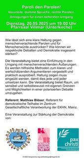 Die Veranstaltung bietet eine Einführung in den Umgang mit menschenverachtenden Äußerungen. Es werden hilfreiche Methoden zum klaren und wertschätzenden Argumentieren vorgestellt und praktisch ausprobiert. Haltung zeigen muss eingeübt werden, damit dies jede und jeder umsetzen kann. Die Veranstaltung bietet Raum, um sensibel und selbstbewusst mit eigenen Grenzen und Möglichkeiten in einer polarisierten Debatte umzugehen.