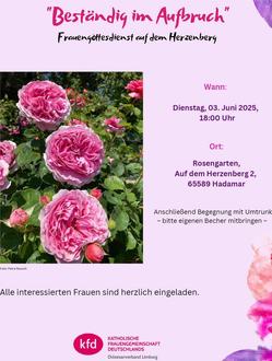 Der kfd-Diözesanverband Limburg feiert am Dienstag, den 03. Juni 2025 einen Frauengottesdienst auf dem Herzenberg in Hadamar. Er beginnt um 18:00 Uhr im Rosengarten bei der Rose, für die der Diözesanverband im Jahr 2023 eine Patenschaft übernommen hatte. Der Gottesdienst trägt den Titel: „Beständig im Aufbruch“.