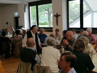 Auf den ein oder anderen Bildern werden Personen erkannt. Lebhafte Gespräche entwickeln sich an den Tischen, geprägt von vielen Erinnerungen und Emotionen. Die Gäste freuen sich sehr, dass Schwester Hermania es auf sich nimmt und zu jedem einzelnen Tisch geht, um hier direkt das Gespräch zu suchen.
