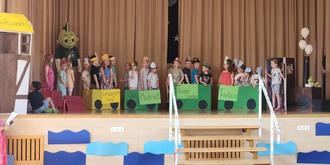 Beim ersten Programmpunkt, wurde die Geschichte von Jolinchen und seiner Reise ins Bunt und Leckerland von allen Kindern der Kita vorgeführt. Begeistert fuhr Jolinchen mit dem selbst gebauten Drachenzug von Haltestelle zu Haltestelle um gesunde Leckereien einzusammeln, damit es immer fit und voller Energie bleibt.
