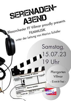 Am Samstag, den 15. Juli 2023 um 19:00 Uhr lädt das Blasorchester der FF Villmar zu seinem Serenadenabend im Pfarrgarten ein. Im stilvollen Ambiente, umgeben von Kirche und Pfarrhaus, lautet das diesjährige Motto „Filmmusik“.