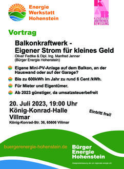 19 Uhr in den Großen Saal der König-Konrad-Halle zu einem Vortrag rund um Balkonkraftwerke ein: Ein eigenes Mini-Kraftwerk auf dem Balkon, dem Dach, der Gartenlaube, an der Hauswand oder auf der Garage? Mit 1-2 Photovoltaikmodulen, einem Wechselrichter, Anschlusskabel und einer Steckdose ist es schnell installiert und produziert grünen Strom für den sofortigen Verbrauch im eigenen Hausnetz. Ein Beitrag zur Nachhaltigkeit mit Reduzierung des Strombezugs aus dem Netz und damit geringere Stromrechnung. In dem Vortrag informieren Oliver Fedtke und Dipl. Ing. Manfred Jenner von der Bürgerenergie Hohenstein über alles Wissenwerte rund um Balkonkraftwerke. Bürgerenergie Hohenstein, eine Zweigniederlassung der Genossenschaft pro regionale energie eG, gibt auch praktische Tips zur Montage und Inbetriebnahme vor Ort zeigt. Der Eintritt ist frei.