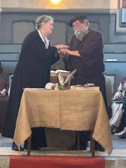 Dass „Luthers Hochzeitstag“, zu dem sich die Akteure schon vor vielen Jahren verabredet hatten, nicht zu einem langweiligen Historienstück wurde, lag auch am schauspielefrischen Talent der beiden, die mit wenigen Requisiten, die Eheleute von einst zu lebendigen Charakteren werden ließen.