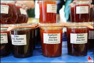 Verarbeitet wird fast alles, was bei uns Region wächst. Das Marmeladenjahr beginnt mit gold-gelbem Löwenzahn-Gelee und Mai-Spitze (aus jungen Fichtentrieben). Und dann geht es aus Wiese und Wald in die Gärten: Rhabarber und Erdbeere, Himbeere, Johannisbeere, Stachelbeere, Jostabeere. Wenn möglich Mirabellen, Kirschen, Pfirsiche und Aprikosen. Im Herbst geht es mit Brombeeren, Trauben und Holunder weiter, zeitgleich dann Äpfel, Birnen und Sanddorn. Nach den Quitten kommen noch Hagebutten und Schlehen zum Zuge. Manches als Gelee, anderes als Konfitüre, häufig pur, zuweilen geschickt kombiniert.