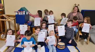 Die Kinder bastelten im Rahmen der Musikalischen Früherziehung ihre eigenen Rasseln aus Joghurtbechern und wurden zum Abschluss mit einer Urkunde geehrt. Darauf waren sie besonders stolz.