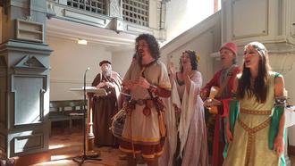 Nach der Eröffnung durch Kirchenvorsteherin Tina Kaiser und Organist Martin Buschmann gestaltete dann Pfarrer Ulrich Finger (Münster und Weyer) in seiner Rolle als mittelalterlicher Prediger Hulderych de Fromholdeskerke in kraftvollen Worten und eindrucksvollen Beispielen den Gottesdienst, wobei ihm zur großen Freude aller die Musikgruppe „Les Derniers Trouvéres“ aus Paris zur Seite stand. Die fünf Musizierenden verstanden es mit ihren Liedern und Melodien, den Kirchenraum musikalisch zu füllen und die stattliche Gemeinde zu großem Applaus zu begeistern. Dass die beiden Damen des Ensembles im Anschluss an den Gottesdienst mit pfarrhausmacher Marmeladen beschenkt wurden, versteht sich von selbst.