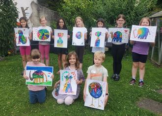 Bei dem 2. Malkurs ging es bei den 8 bis 12 jährigen Künstlern und Künstlerinnen um „Happy Painting“. Lustige Bilder sollten entstehen. Die Kinder haben entweder mit Wasserfarben oder Acrylfarbe das Papier eingefärbt oder Kringel gemalt. Zum Einsatz kamen Aquarell-, Farb-, Acryl-, Filz-, Ölstifte oder Fineliner, aber auch mit Farbe und Pinsel konnte gearbeitet werden. Alle konnten sich künstlerisch austoben und sich nach Lust und Laune kreativ ausprobieren. Die vielfältigsten Bilder von der Katze bis zum Einhorn werden in der nächsten Zeit die Kinderzimmer schmücken.
