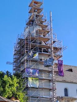 Immer wieder bleiben Passanten stehen und schauen auf das hohe Gerüst am Turm der Münsterer evangelischen Kirche. Dringend notwendig, so Kirchenvorstandsvorsitzender Otto Hofmann, war die Sanierung des Daches des Kirchturms. An zahlreichen Stellen waren Undichtigkeiten aufgetreten, Wasser drang ein in den Turm, gefährdete das Mauerwerk, aber auch Uhrwerk und Glockenanlage.