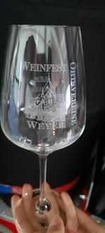 Vor wenigen Tagen erst wurden die Weinkelche geliefert, die speziell für das 1. Weinfest der Weyrer Ortsvereine hergestellt wurden. Sie zeigen neben einer entsprechenden Beschriftung die Weyrer Kirche. Foto: Finger