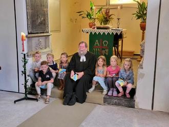 Im lebendigen Familiengottesdienst begleitete Pfarrer Finger die neuen Schulkinder im Sinne des Wortes bin an die Türe der Schule.