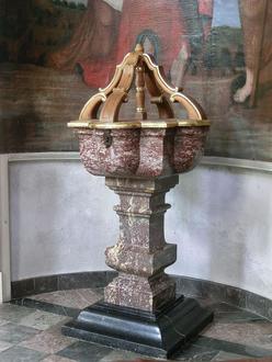 Vor 300 Jahren wurde der bis heute benutzte Taufstein aus drei Lahnmarmor-Sorten errichtet, wovon die Inschrift in der Säule zeugt. Er stammt somit noch aus dem Vorgängerbau der 1746-49 erbauten Kirche.