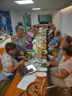 Was haben eingelegte Gurken, Salami und Frischkäse gemeinsam? Alles enthält Zucker! Das und noch einige andere überraschende Fakten zum Thema Zucker lernten die Landfrauen Weyer von der ErnährungsfachFrau Ilka Kullmann. Das Thema „Leicht und lecker kochen mit wenig Zucker“ lockte 13 Weyerer Landfrauen in den Weyerer Vereinsraum. Dort erwartete sie eine bestens vorbereitete Tafel mit Zutaten für zwei Salate, einen Apfel-Hirseauflauf, ein Gemüsecurry und zwei Desserts. Doch bevor sich die Damenrunde ans Werkeln machte, verriet Ilka Kullmann noch manch wissenswerte zum Thema Zucker. Dass beispielsweise Nutella viel Zucker enthält, war allen klar - aber die Menge verblüffte dann doch: Ilka Kullmann hatte die exakte Zuckermenge in ein Original-Glas gefüllt - und das war damit dann zu gut ¾ gefüllt. Aber es gibt durchaus Alternativen zu diesem süßen Brotaufstrich: Quasi als Vorspeise bot die Fachfrau Vollkornbrot mit einem selbstgemachten Brotaufstrich aus Backpflaumen, Nüssen und Mandeln an. Dann ging’s ans gemeinsame Zubereiten. Rotkohl hobeln und dünsten, Wassermelone und Feta fein würfeln, Äpfel klein schneiden und mit Hirsebrei zu einem Auflauf schichten, Gemüse putzen und dünsten und noch einiges mehr. Von blitzschnell bis raffiniert reichte die Rezeptpalette, und satt geworden sind letztendlich auch alle.