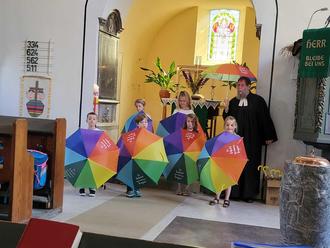 Villmar-Weyer (uf) Farbenfrohe Regenschirme gab es für die Schulanfängerinnen und Schulanfänger im Gottesdienst in der evangelischen Kirche in Weyer. Nicht nur - wie Pfarrer Finger in einer bunten Schau der Kopfbedeckungen demonstrierte - kann uns Gott behüten, sondern Gott will auch "Schutz und Schirm vor allem Argen" sein - wie dies in vielen alten Gebeten glaubend ausgesprochen wird.