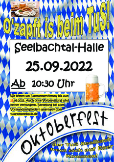 Bedingt durch Corona konnte der TuS 1905 Seelbach in den vergangenen 2 Jahren sein Oktoberfest nicht durchführen. Nunmehr soll diese liebgewordene Tradition am 25.09.2022 ab 10:30 Uhr in der Seelbachtal-Halle wiederbelebt werden. Mit zünftiger „Live-Musik“ von Frederik Heider und mit Haxe, Leberkäse, Weißwürstl und Festbier hoffen die TuS-Verantwortlichen an alte Zeiten anknüpfen zu können. Zur besseren Organisation wird um eine Essensvorbestellung bis zum 16.09.2022 bei Gerhard H. Weil (Tel.: 0171 3386080) oder Karin Scholz (Tel.: 06474-1700) sowie bei jedem Vorstandsmitglied gebeten. Ebenfalls kann eine Vorbestellung über das Internet unter www.tus1905seelbach.de erfolgen. Aber auch Kurzentschlossene werden nicht verhungern! Essen kann auch ab 12:00 Uhr abgeholt werden. Wer in Dirndl oder Lederhose erscheint, erhält einen Begrüßungsschnaps. Da auch in den vergangenen Jahren keine Vereinsehrungen vorgenommen werden konnten, werden diese Ehrungen im Rahmen des Oktoberfestes nachgeholt. Der TuS freut sich bei freiem Eintritt über zahlreiche Besucher.