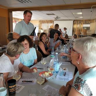 Winzer Markus Klosheim (links, stehend) berichtete den Landfrauen viel Wissenswertes rund um den Wein und seinen Betrieb.