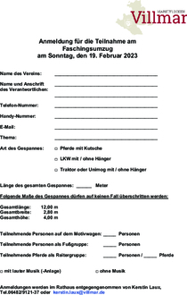 Anmeldungen für die Teilnahme am Faschingsumzug werden bis 07.02.2023 im Rathaus von Frau Kerstin Laux gerne persönlich, telefonisch unter 06482-912137 oder per E-Mail: Kerstin.Laux@villmar.de, entgegengenommen.