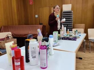 Landfrau Svenja Heun zeigte den jährlichen Verbrauch an Plastikflaschen aus einem durchschnittlichen deutschen Badezimmer und Alternativen, die ganz ohne Plastik auskommen.