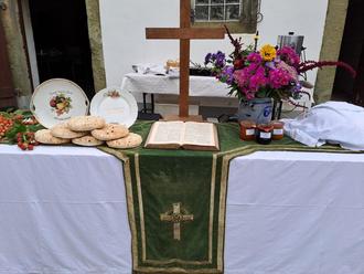 Villmar-Weyer (uf) Bei herrlichem Spätsommerwetter fand der Erntedankgottesdienst der Evangelischen Kirchengemeinde Weyer im Hof der "Olemühle" der Familie Raab-von der Heyde in der Ortsmitte von Weyer statt.