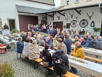 Im stilvoll gestalteten Innenhof des früheren Mühlen-Anwesens traf sich am letzten Septembersonntag eine stattliche Gemeinde, um gemeinsam Erntedankfest zu feiern. Musikalische Unterstützung gab es durch den Kirchenchor Weyer unter Leitung von Nicole Ebel; der Gemeindegesang wurde von Pfarrer Ulrich Finger mit der Gitarre begleitet.