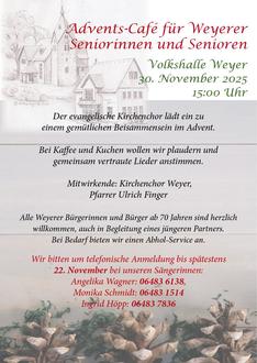 Am 30. November, 15 Uhr, lädt der Kirchenchor alle Weyerer Seniorinnen und Senioren zu einem gemütlichen Beisammensein im Advent ein. In der vorweihnachtlich dekorierten Weyerer Volkshalle wollen wir bei Kaffee und selbstgebackenem Kuchen über alte und neue Zeiten plaudern, gemeinsam vertraute Lieder anstimmen und Geschichten lauschen. Der Kirchenchor wird einige Weihnachtsweisen vortragen und Pfarrer Ulrich Finger die eine oder andere Anekdote zum Thema Advent zum Besten geben.