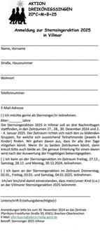 Nutzen Sie gerne vor genannte Kontaktmöglichkeiten oder unser Formular, um Ihre Unterstützung der Aktion Dreikönigssingen 2025 in Villmar mitzuteilen.