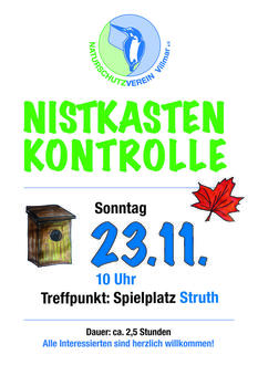 Der Naturschutzverein Villmar lädt alle Interessierten auf die Struth zur jährlichen Nistkastenkontrolle ein. Am Sonntag, 23.11. um 10:00 Uhr ist Treffpunkt auf dem Waldspielplatz auf der Struth. Von da aus geht es über die Tellswiese bis hinunter zur Lahn, wo auch wieder für ein Picknick gesorgt sein wird.