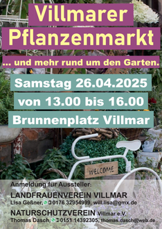 Die Villmarer Landfrauen und der Naturschutzverein Villmar e.V. laden zum 3. Villmarer Pflanzenmarkt für Samstag, den 26.04.2025, in der Zeit von 13.00 bis 16.00, auf dem Brunnenplatz ein.