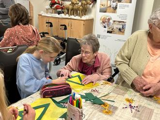 Gemeinsam geht's leichter! Zusammen basteln die Senioren und die Landkids wunderbare kleine Dekorationen.