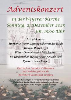 Der Kirchenchor Weyer lädt am Sonntag, 21. Dezember, 15:00 Uhr, zum Adventskonzert in die Weyerer Kirche ein. Der Chor wird geleitet von Nicole Ebel. Gemeinsam mit dem gemischten Chor SingFonie Weyer, Leitung Silke von der Heidt, gestalten wir für Sie ein Programm mit stimmungsvollen Advents- und Weihnachtsliedern. Ebenfalls eingeladen haben Thomas Roth, der mit seinem Orgelspiel festliche Akzente setzen wird. Besonders freuen wir uns auf die Mitwirkung unseres jungen Bläser-Duos, Nele und Jette Meuser. Der Eintritt ist frei, aber wir freuen uns sehr über Ihre Spenden, die wir in diesem Jahr an die Bärenherz-Gesellschaft Limburg weitergeben dürfen. Das Adventskonzert ist gleichzeitig das 21. Fenster unseres Dorf-Adventskalenders. Im Anschluss an das Konzert laden wir daher herzlich zu heißen Getränken vor der Kirche ein. Bitte bringen Sie eine Tasse mit.