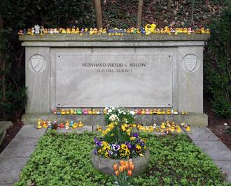 In Erinnerung an den berühmten Dialog der beiden Männer in der Badewanne zieren zahlreiche Quietsche-Entchen das Grabmal des Komikers Loriot in Berlin. Foto: gemeinfrei Wikipedia