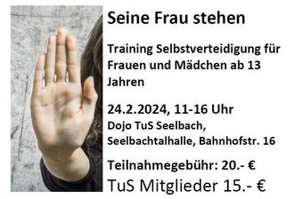 Die Karateabteilung des TuS Seelbach bietet am Samstag, den 24.2.2024, von 11-16 Uhr in der Seelbachtalhalle einen ersten Kurs zur Selbstverteidigung für Frauen und Mädchen ab 13 Jahren an.