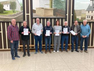 Die geehrten Mitglieder (v. l.) Dietmar Jost, Jürgen Bautz, Horst-Werner Benner, Britta Binhack, Helfried Zanger und Jochen Würges mit dem scheidenen Vorsitzenden Uwe Eller (ganz links) und dem neu gewählten Vorsitzenden Michael Legner (ganz rechts)