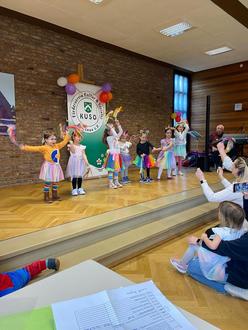 Mit großem Einsatz eröffneten die Jüngsten des TuS Aumenau, die „Mini-Flitzer“, die voll besetzte Veranstaltung. Es bewegten sich sowohl Einhörner als auch in bunten Röckchen gekleidete Mädchen zu dem Lied vom Regenbogen und ernteten großen Beifall.