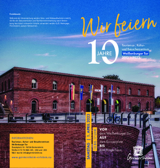 Mit einem abwechslungsreichen Bühnenprogramm, vielen tollen Kinderangeboten, u.a. einer Hüpfburg, erlebnisreichen Schnupperführungen „Vom Weißenburger Tor zum Stadtpark Fronte Lamotte“, der informativen Wanderausstellung „Stadt, Land, Heimat - unsere Metropolregion Rhein-Neckar“ und einer Verlosung mit attraktiven Preisen feiert das Tourismus-, Kultur- und Besucherzentrum am Samstag, dem 01. April 2023 von 10-17 Uhr vor dem Weißenburger Tor, auf dem Europaplatz bis zum Bürgerhaus in Germersheim sein 10-jähriges Bestehen. Für das leibliche Wohl ist bestens gesorgt. Reichhaltige Informationen und vor allem jede Menge Spaß sind an diesem Tag für Groß und Klein garantiert!
