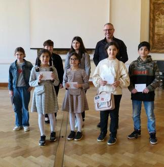 Bürgermeister Marcus Schaile mit den glücklichen Germersheimer Preisträgerinnen und Preisträgern des Lesesommers Rheinland-Pfalz 2022. Foto: SMohr| Stadt Germersheim