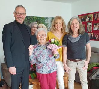 Ihren 93. Geburtstag feierte am Mittwoch vergangener Woche Frau Christiane Troubat in Germersheim. Bürgermeister Marcus Schaile überbrachte der sympathischen Altersjubilarin zu diesem besonderen Anlass die herzlichen Grüße und Glückwünsche der Stadt sowie einen hübschen Frühlingsgruß, über den sich die gebürtige Französin besonders freute. Unser Bild zeigt das Geburtstagskind zusammen mit seinem Sohn, seiner Schwiegertochter und dem Germersheimer Stadtoberhaupt.