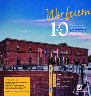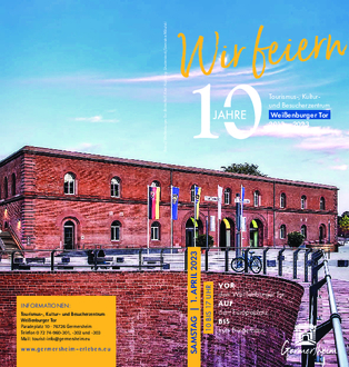 Mit einem abwechslungsreichen Bühnenprogramm, vielen tollen Kinderangeboten, erlebnisreichen Schnupperführungen „Vom Weißenburger Tor zum Stadtpark Fronte Lamotte“, der informativen Wanderausstellung „Stadt, Land, Heimat - unsere Metropolregion Rhein-Neckar“ und einer Verlosung mit attraktiven Preisen feiert das Tourismus-, Kultur- und Besucherzentrum am Samstag, dem 01. April 2023 von 10-17 Uhr vor dem Weißenburger Tor, auf dem Europaplatz bis zum Bürgerhaus in Germersheim sein 10-jähriges Bestehen. Für das leibliche Wohl ist bestens gesorgt. Reichhaltige Informationen und vor allem jede Menge Spaß sind an diesem Tag für Groß und Klein garantiert!