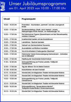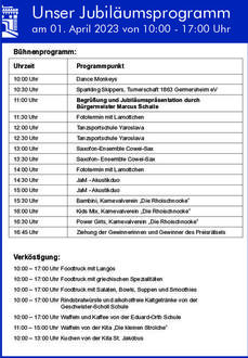 Was wäre eine Jubiläumsveranstaltung ohne Verlosung? Das Preisrätsel, bei dem Buchstaben „gesammelt“ und das Lösungswort gefunden wird gilt nur am Samstag, dem 01. April 2023. Das dafür notwendige Rätsel-Formular ist ab 10:00 Uhr im Tourismus-, Kultur- und Besucherzentrum erhältlich. Die Ziehung der Gewinnerinnen und Gewinner findet am Jubiläumstag um 16:45 Uhr auf der Bühne statt.