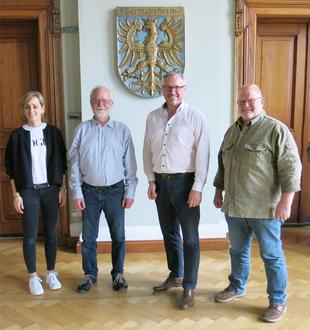 Martin Wiezorrek (2.v.l.) geht nach 38 Jahren als Leiter der Spiel- und Lernstube in seinen wohlverdienten Ruhestand. Für die neue Lebensphase wünschten ihm Bürgermeister Marcus Schaile (2.v.r.) sowie Büroleiterin Katrin Kunz und Personalratsvorsitzender Franz Dehof von Herzen Gesundheit und alles Gute. Foto: SNelles | Stadt Germersheim