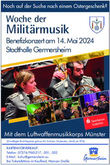 Nach der offiziellen Eröffnung findet in Germersheim bereits am Dienstag, dem 14. Mai 2024 um 19.30 Uhr, ein Benefizkonzert des Luftwaffenmusikkorps Münster in der Stadthalle statt. Der Erlös dieses Abends wird anschließend einer in Germersheim ansässigen sozialen Organisation zufließen. Am Mittwochvormittag findet dann ein Konzert für die Germersheimer Schulen statt, bei dem das Heeresmusikkorps Koblenz den jungen Zuhörerinnen und Zuhörern die musikalische Bandbreite ihres Orchesters näherbringen möchte und das ganz im Zeichen der Nachwuchsförderung steht.