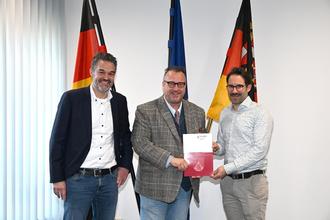 Staatssekretär Andy Becht (Bildmitte) mit dem Ersten Beigeordneten der Stadt Germersheim Dr. Sascha Hofmann (links im Bild) und Benjamin Berger, dem stellvertretenden Abteilungsleiter der städtischen Bauverwaltung. Foto: MWVLW-RLP / Kristina Schäfer