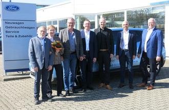 (V.l.n.r.) Günter und Beatrix Deutschler, Germersheims Bürgermeister Marcus Schaile, Centerleiter Mario Deutschler, Dominik Bessler (Sprecher der Geschäftsführung der Autowelt.Ebert) sowie Volker Knapp und Uwe Reinhard, die gemeinsam die Geschäftsführung des ehemaligen Familienunternehmens Autohaus Deutschler GmbH übernommen haben, bei der offiziellen Geschäftsübergabe am 28. März 2025. Fotos: SNelles | Stadt Germersheim