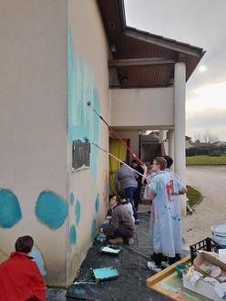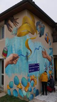 Nach Gesprächen über die Planung des gemeinsamen Projekts, über die Auswahl der Motive und über das finale Modell, waren alle mit Pinsel, Rollen oder Farbsprühdosen bewaffnet, unter den wohlwollenden Augen des Künstlers bis zur endgültigen Installation der Wandmalerei.